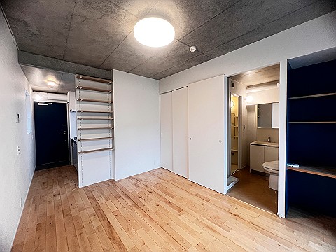 202号室ヴァーチャル間取図 クローゼット デスク(下部にLAN端子付)室内6(洗面・トイレ戸開) 室内6(洗面・トイレ戸閉) 洗濯機置き場洗面・トイレ 玄関入口 ホール バスルーム 洗面・トイレ・洗濯機置き場 バルコニー2 DESK(下部にLAN端子付) バルコニー1 室内5 室内4 室内3 室内2 室内1 キッチン 靴箱内部 キッチン・ホール 玄関から室内